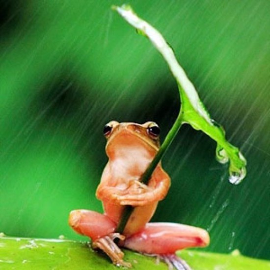 이 사진은 사진작가 펜크딕스 팔메(27)가 인도네시아에서 찍은 것이라고 한다. 사진속 이 개구리는 무려 30분이나 비가 내리는 방향으로 나뭇잎을 이리저리 기울여가며 비를 피했다고 한다. 개구리가 나뭇잎을 우산 삼아 비바람을 피하고 있는 모습이 보는 이들을 놀라게 한다.