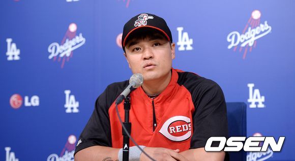 26일(한국시간) 미국 캘리포니아주 로스앤젤레스 다저스타디움에서 열린 2013 메이저리그 LA 다저스와 신시내티 레즈의 경기에 앞서 신시내티 추신수가 기자회견을 하고 있다.
