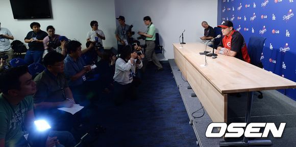 26일(한국시간) 미국 캘리포니아주 로스앤젤레스 다저스타디움에서 열린 2013 메이저리그 LA 다저스와 신시내티 레즈의 경기에 앞서 신시내티 추신수가 기자회견을 하고 있다.