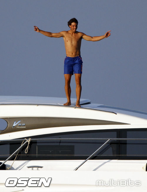 보트 지붕 위에서 점프 준비 중인 라파엘 나달