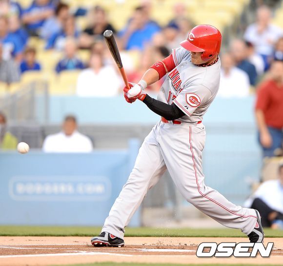 26일(한국시간) 미국 캘리포니아주 로스앤젤레스 다저스타디움에서 열린 2013 메이저리그 LA 다저스와 신시내티 레즈의 경기, 1회초 무사에서 신시내티 추신수가 내야땅볼을 치고 있다.