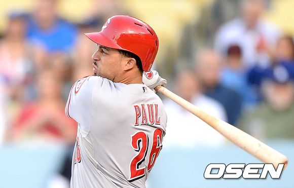 26일(한국시간) 미국 캘리포니아주 로스앤젤레스 다저스타디움에서 열린 2013 메이저리그 LA 다저스와 신시내티 레즈의 경기, 1회초 1사에서 신시내티 폴이 우중월 솔로 홈런을 치고 있다.