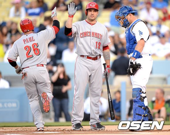 26일(한국시간) 미국 캘리포니아주 로스앤젤레스 다저스타디움에서 열린 2013 메이저리그 LA 다저스와 신시내티 레즈의 경기, 1회초 1사에서 신시내티 폴이 우중월 솔로 홈런을 치고 보토와 하이파이브를 하고 있다.