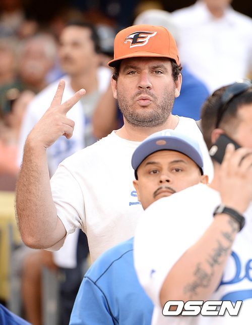 26일(한국시간) 미국 캘리포니아주 로스앤젤레스 다저스타디움에서 열린 2013 메이저리그 LA 다저스와 신시내티 레즈의 경기, 경기에 앞서 한화 모자를 쓴 야구팬이 취재진을 향해 포즈를 취하고 있다.