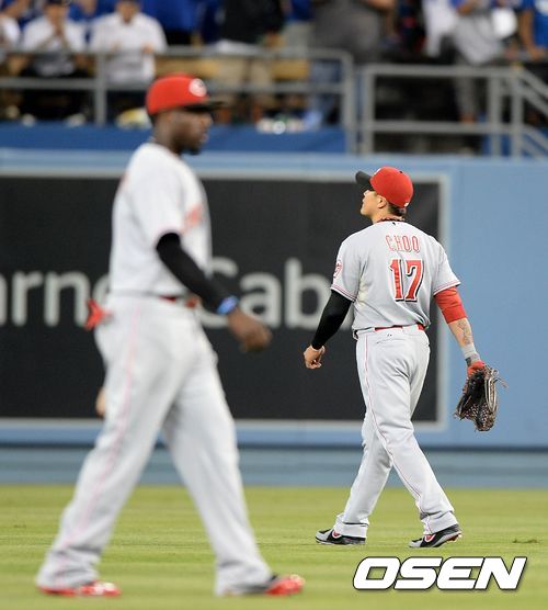 26일(한국시간) 미국 캘리포니아주 로스앤젤레스 다저스타디움에서 열린 2013 메이저리그 LA 다저스와 신시내티 레즈의 경기, 4회초 무사에서 LA 푸이그의 타구를 송구 실책한 신시내티 추신수가 아쉬워하고 있다.