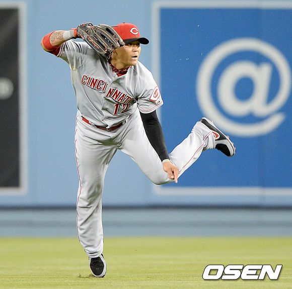 26일(한국시간) 미국 캘리포니아주 로스앤젤레스 다저스타디움에서 열린 2013 메이저리그 LA 다저스와 신시내티 레즈의 경기, 4회초 무사에서 신시내티 추신수가 LA 푸이그의 타구를 잡아 1루로 송구하고 있다. 이 공은 1루수를 벗어나 송구 실책을 기록했다.