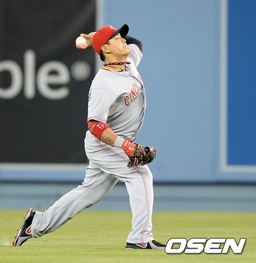26일(한국시간) 미국 캘리포니아주 로스앤젤레스 다저스타디움에서 열린 2013 메이저리그 LA 다저스와 신시내티 레즈의 경기, 4회초 무사에서 신시내티 추신수가 LA 푸이그의 타구를 잡아 1루로 송구하고 있다. 이 공은 1루수를 벗어나 송구 실책을 기록했다.