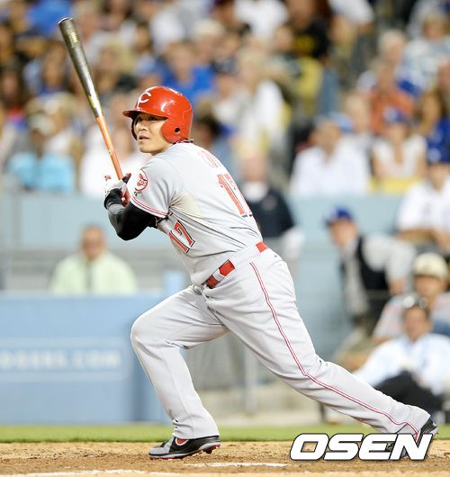 26일(한국시간) 미국 캘리포니아주 로스앤젤레스 다저스타디움에서 열린 2013 메이저리그 LA 다저스와 신시내티 레즈의 경기, 5회초 1사 2루에서 신시내티 추신수가 내야땅볼을 치고 있다.