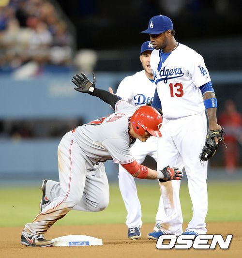 26일(한국시간) 미국 캘리포니아주 로스앤젤레스 다저스타디움에서 열린 2013 메이저리그 LA 다저스와 신시내티 레즈의 경기, 8회초 1사 1루에서 신시내티 1루주자 추신수가 보토의 안타를 외야플라이로 착각해 1루로 귀루하다 아웃처리 되고 있다.