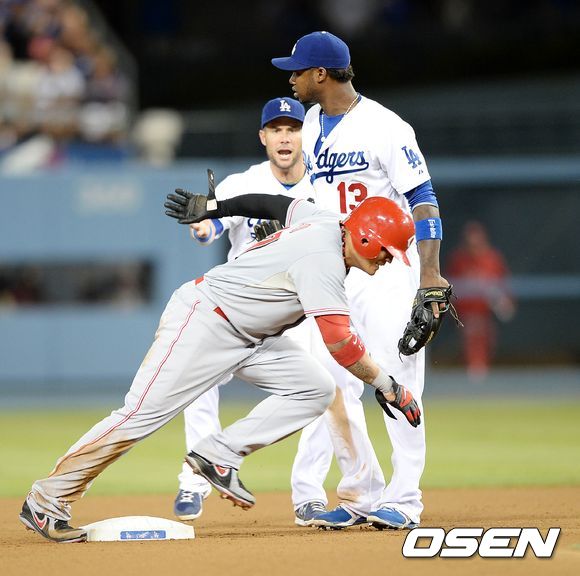 26일(한국시간) 미국 캘리포니아주 로스앤젤레스 다저스타디움에서 열린 2013 메이저리그 LA 다저스와 신시내티 레즈의 경기, 8회초 1사 1루에서 신시내티 1루주자 추신수가 보토의 안타를 외야플라이로 착각해 1루로 귀루하다 아웃 되고 있다.