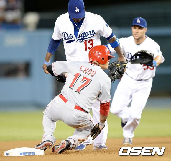 26일(한국시간) 미국 캘리포니아주 로스앤젤레스 다저스타디움에서 열린 2013 메이저리그 LA 다저스와 신시내티 레즈의 경기, 8회초 1사 1루에서 신시내티 1루주자 추신수가 보토의 안타를 외야플라이로 착각해 1루로 귀루하다 아웃 되고 있다.