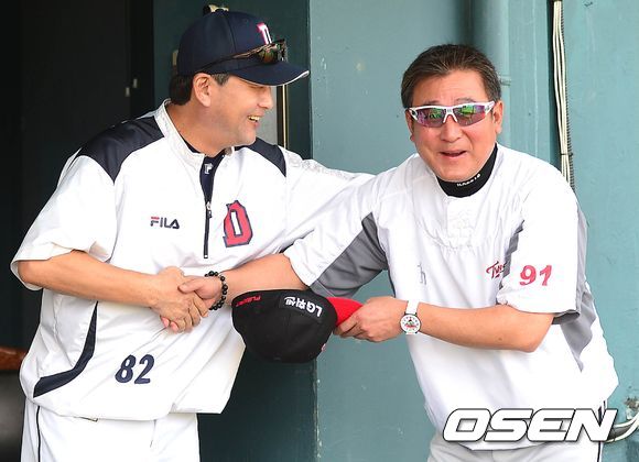 26일 오후 서울 잠실야구장에서 열리는 '2013 한국야쿠르트 세븐 프로야구' 두산 베어스 대 LG 트윈스의 경기를 앞두고 두산 김진욱 감독과 LG 김기태 감독이 인사를 나누고 있다.