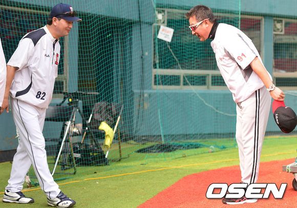 26일 오후 서울 잠실야구장에서 열리는 '2013 한국야쿠르트 세븐 프로야구' 두산 베어스 대 LG 트윈스의 경기를 앞두고 두산 김진욱 감독과 LG 김기태 감독이 인사를 나누고 있다.