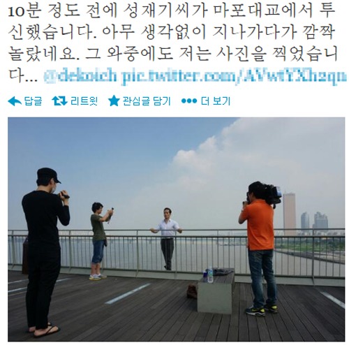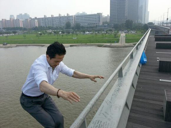 [OSEN=이슈팀] 한강 투신을 예고했던 성재기 남성연대 대표가 26일 한강 투신에 나선 모습이 SNS를 통해 공개돼 사회적 물의를 빚고 있다. 성재기 대표는 26일 자신의 트위터에 "정말 부끄러운 짓입니다. 죄송합니다. 평생 반성하겠습니다"라는 글과 함께 한강 다리 위에서 뛰어 내리는 자신의 모습을 찍은 사진을 공개했다.