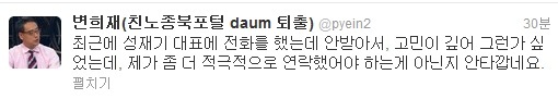 변희재 대표는 26일 자신의 트위터를 통해 "최근에 성재기 대표에 전화를 했는데 안받아서, 고민이 깊어 그런가 싶었는데, 제가 좀 더 적극적으로 연락했어야 하는게 아닌지 안타깝네요"라는 글을 올렸다.