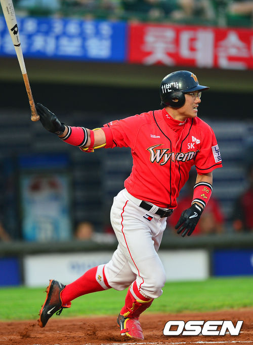 26일 오후 부산 사직구장에서 열린 2013 한국야쿠르트 세븐프로야구 롯데 자이언츠와 SK 와이번스의 경기, 3회초 2사 주자 만루 SK 박정권이 선취 2타점 적시타를 날리고 있다.