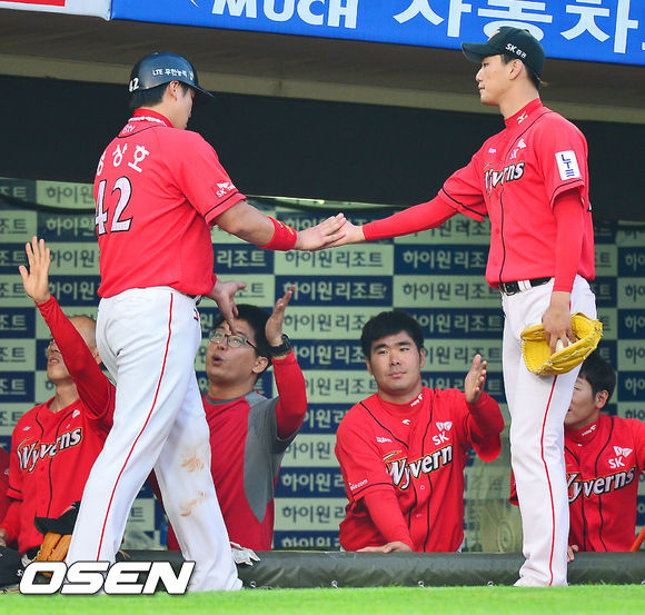26일 오후 부산 사직구장에서 열린 2013 한국야쿠르트 세븐프로야구 롯데 자이언츠와 SK 와이번스의 경기, 3회초 2사 주자 만루 SK 박정권의 선취 2타점 적시타때 홈을 밟은 정상호가 선발 김광현과 하이파이브를 하고 있다.