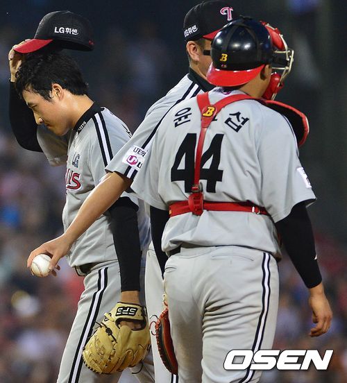 26일 오후 서울 잠실야구장에서 열리는 '2013 한국야쿠르트 세븐 프로야구' 두산 베어스 대 LG 트윈스의 경기가 열렸다. 3회말 두산 공격 무사 만루 상황 LG 선발 신정락이 마운드를 내려가고 있다.