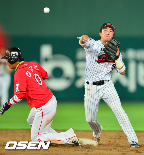 26일 오후 부산 사직구장에서 열린 2013 한국야쿠르트 세븐프로야구 롯데 자이언츠와 SK 와이번스의 경기, 5회초 무사 주자 1,3루 SK 박진만의 3루수 병살타때 롯데 2루수 정훈이 2루에서 SK 김강민을 포스아웃 시킨 후 1루로 송구하고 있다.