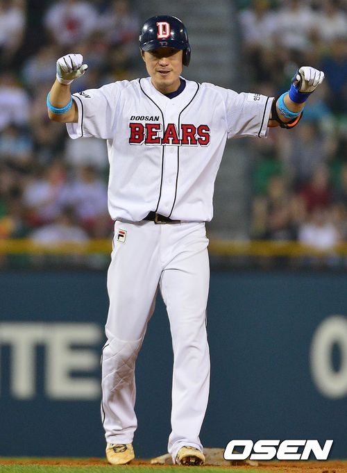 26일 오후 서울 잠실야구장에서 '2013 한국야쿠르트 세븐 프로야구' 두산 베어스 대 LG 트윈스의 경기가 열렸다. 3회말 두산 공격 2사 2루 상황 9번타자 김재호가 역전 1타점 적시 좌익선상 2루타를 날리고 환호하고 있다.