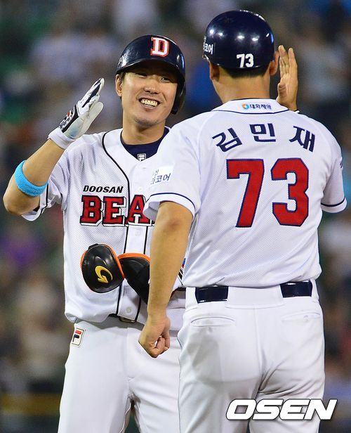 26일 오후 서울 잠실야구장에서 '2013 한국야쿠르트 세븐 프로야구' 두산 베어스 대 LG 트윈스의 경기가 열렸다. 3회말 두산 공격 2사 2루 상황 9번타자 김재호가 역전 좌익선상 2루타를 날리고 김민호 코치와 인사를 나누고 있다.