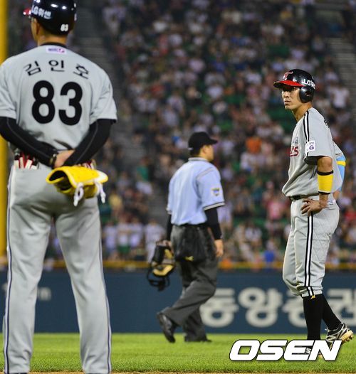 4회초 LG 공격 1사 1루 상황 4번타자 정성훈의 우익수 방면 타구가 아웃판정을 받았다가, 양 팀 감독의 어필과 심판진의 협의 끝에 두산 우익수 정수빈의 원바운드 캐치로 판정됐다. 자신의 타구가 아웃판정을 받자 그라운드를 떠나지 못하고 서있는 LG 정성훈.