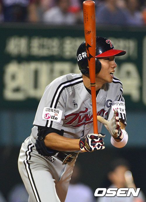 4회초 LG 공격 2사 1, 3루 상황 7번타자 김용의가 역전 1타점 적시 우전 안타를 날리고 있다.