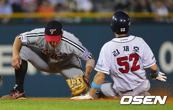 26일 오후 서울 잠실야구장에서 '2013 한국야쿠르트 세븐 프로야구' 두산 베어스 대 LG 트윈스의 경기가 열렸다. 6회말 두산 공격 2사 1루 상황 견제에 걸린 1루주자 김재호의 2루 쇄도 때 LG 유격수 오지환이 1루수 김용의의 송구를 놓치고 있다.