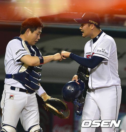 26일 오후 서울 잠실야구장에서 '2013 한국야쿠르트 세븐 프로야구' 두산 베어스 대 LG 트윈스의 경기가 열렸다. 7회초 LG 공격 2사 2루 상황 김용의를 포수 파울플라이로 잡아내며 이닝을 마무리지은 두산 투수 홍상삼이 포수 양의지와 인사를 나누고 있다.