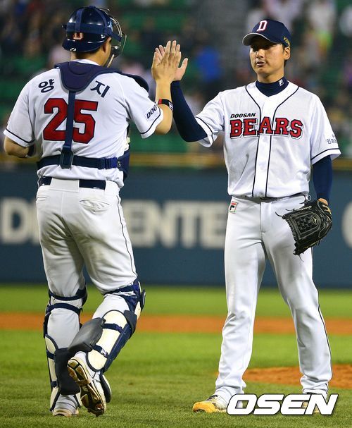 경기를 마무리지은 두산 투수 정재훈과 포수 양의지가 인사를 나누고 있다. /dreamer@osen.co.kr