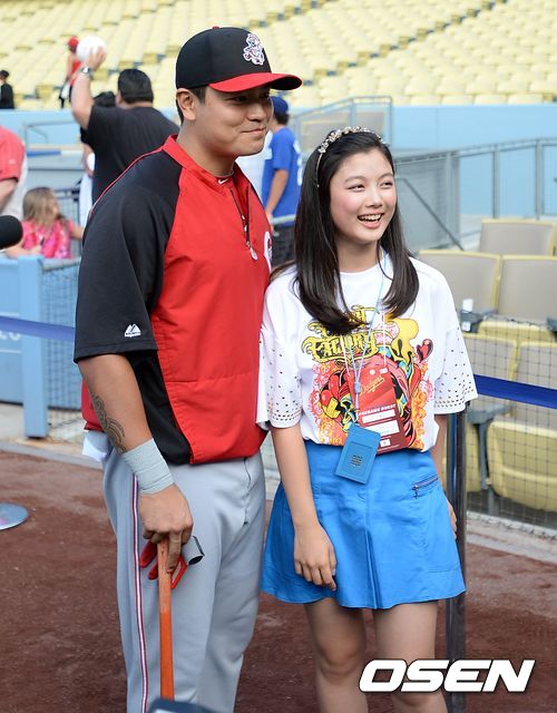 27일(한국시간) 미국 캘리포니아주 로스앤젤레스 다저스타디움에서 열린 2013 메이저리그 LA 다저스와 신시내티 레즈의 경기, 경기에 앞서 신시내티 추신수가 아역 배우 김유정과 기념촬영을 하고 있다.