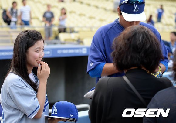 27일(한국시간) 미국 캘리포니아주 로스앤젤레스 다저스타디움에서 열린 2013 메이저리그 LA 다저스와 신시내티 레즈의 경기, 경기에 앞서 아역배우 김유정이 LA 류현진에게 사인을 부탁하고 있다.