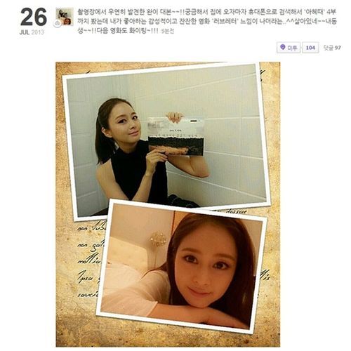김태희는 "촬영장에서 우연히 발견한 완이 대본! 집에 오자마자 검색해서 '아헤때' 4편까지 봤는데 내가 좋아하는 감성적이고 잔잔한 영화 '러브레터' 느낌이 나더라는… 살아있네~ 내 동생~ 다음 영화도 파이팅!"이라며 동생을 응원했다.