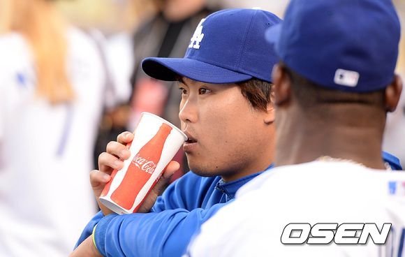 27일(한국시간) 미국 캘리포니아주 로스앤젤레스 다저스타디움에서 열린 2013 메이저리그 LA 다저스와 신시내티 레즈의 경기, 경기에 앞서 LA 류현진이 덕아웃에서 태권도 시범을 바라보고 있다.