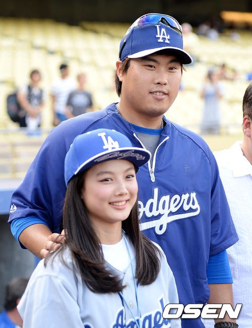 27일(한국시간) 미국 캘리포니아주 로스앤젤레스 다저스타디움에서 열린 2013 메이저리그 LA 다저스와 신시내티 레즈의 경기, 경기에 앞서 LA 류현진이 아역배우 김유정과 기념촬영을 하고 있다.