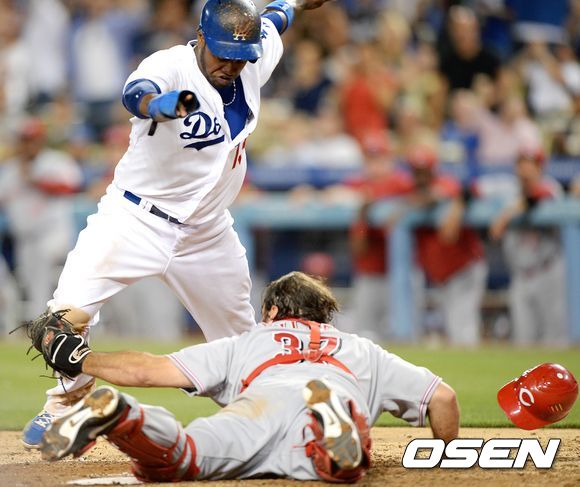 27일(한국시간) 미국 캘리포니아주 로스앤젤레스 다저스타디움에서 열린 2013 메이저리그 LA 다저스와 신시내티 레즈의 경기, 4회말 1사 1,3루 LA 우리베의 외야플라이 때 3루주자 라미레스가 홈으로 쇄도해 포수의 태그를 피하고 있다.