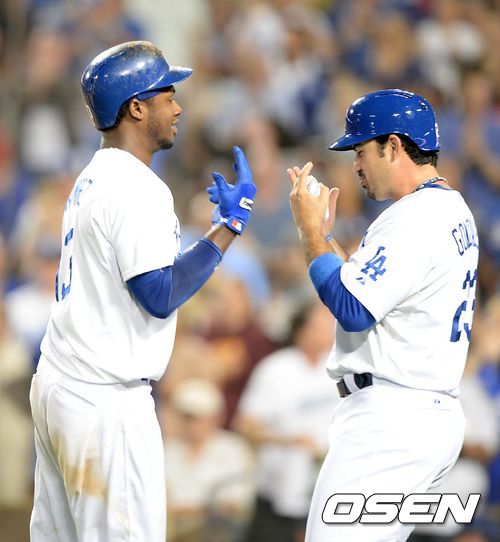 27일(한국시간) 미국 캘리포니아주 로스앤젤레스 다저스타디움에서 열린 2013 메이저리그 LA 다저스와 신시내티 레즈의 경기, 6회말 2사 1루에서 LA 라미레스가 좌월 투런 홈런을 치고 홈에서 곤살레스와 환호하고 있다.