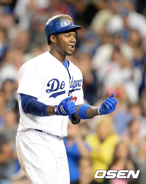 27일(한국시간) 미국 캘리포니아주 로스앤젤레스 다저스타디움에서 열린 2013 메이저리그 LA 다저스와 신시내티 레즈의 경기, 6회말 2사 1루에서 LA 라미레스가 좌월 투런 홈런을 치고 홈에서 환호하고 있다.