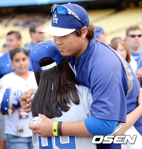 27일(한국시간) 미국 캘리포니아주 로스앤젤레스 다저스타디움에서 열린 2013 메이저리그 LA 다저스와 신시내티 레즈의 경기, 경기에 앞서 LA 류현진이 아역배우 김유정과 포옹을 나누고 있다.