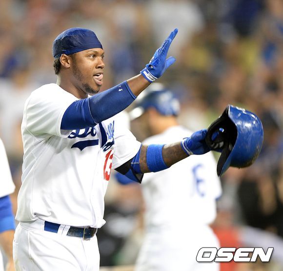 27일(한국시간) 미국 캘리포니아주 로스앤젤레스 다저스타디움에서 열린 2013 메이저리그 LA 다저스와 신시내티 레즈의 경기, 6회말 2사 1루에서 LA 라미레스가 좌월 투런 홈런을 치고 홈에서 환호하고 있다.