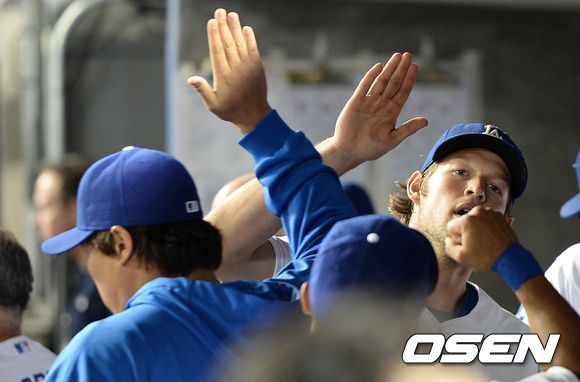 27일(한국시간) 미국 캘리포니아주 로스앤젤레스 다저스타디움에서 열린 2013 메이저리그 LA 다저스와 신시내티 레즈의 경기, 8회말 2사 2루에서 LA 커쇼가 신시내티 헤이시를 플라이로 처리하고 덕아웃에서 류현진과 환호하고 있다.