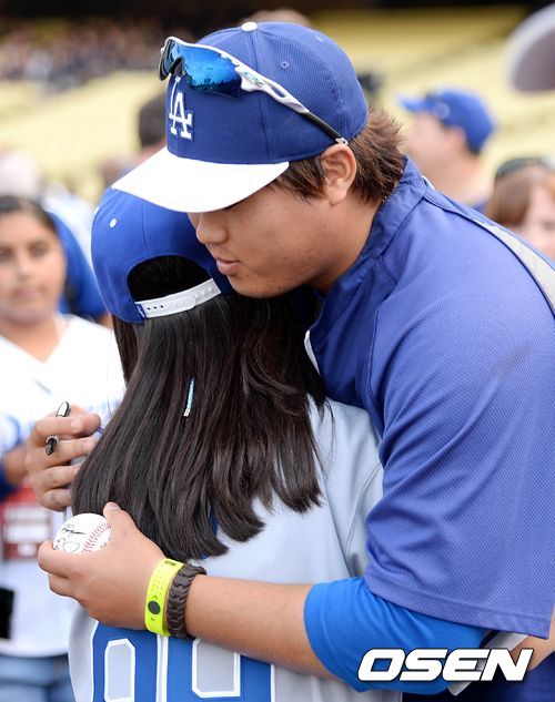 경기에 앞서 LA 류현진이 아역배우 김유정과 포옹을 하고 있다. /sunday@osen.co.kr
