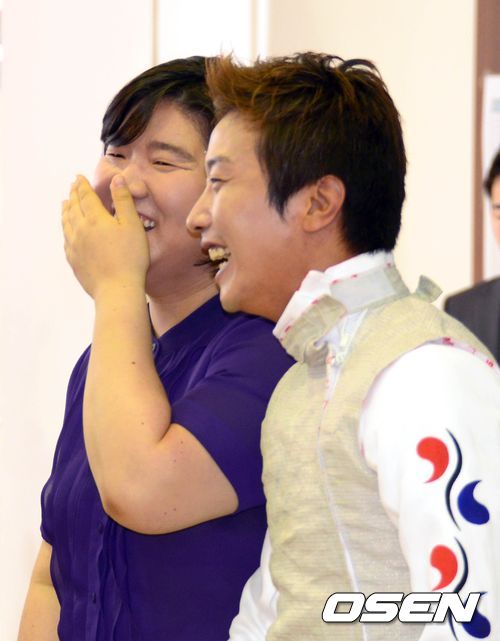 협약식을 마친 후 장미란이 최병철과 환하게 웃고 있다./spjj@osen.co.kr