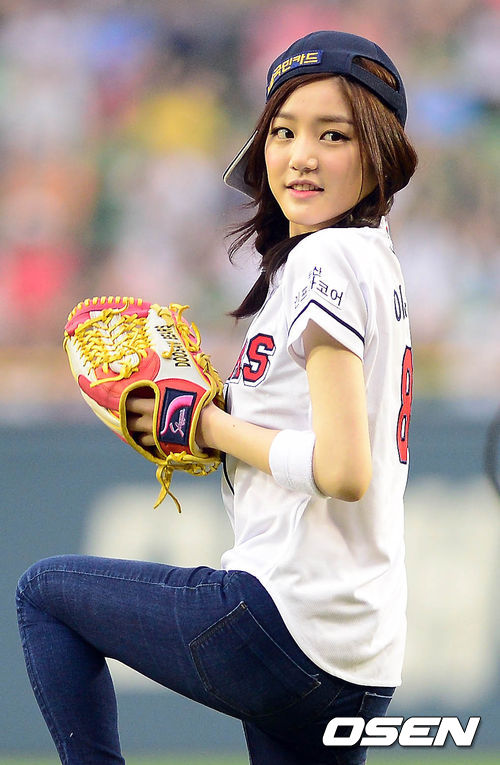 27일 오후 서울 잠실구장에서 열린 '2013 한국야쿠르트 세븐 프로야구' 두산 베어스와 LG 트윈스의 경기 시작 전 이유비가 시구를 하고 있다.