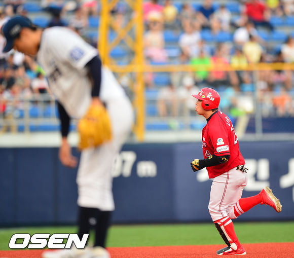 27일 오후 창원 마산야구장에서 열린 2013 한국야쿠르트 세븐프로야구 NC 다이노스와 KIA 타이거즈의 경기, 2회초 KIA 선두타자 나지완이 초구를 노려 좌월 솔로 홈런을 날린 후 그라운드를 돌고 있다.