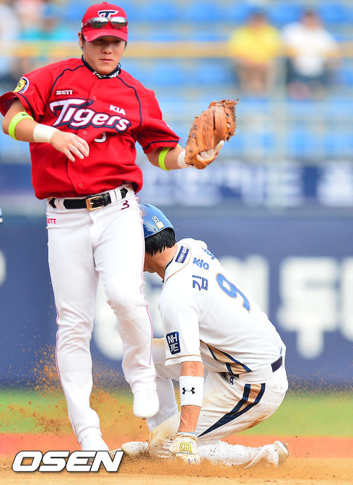 27일 오후 창원 마산야구장에서 열린 2013 한국야쿠르트 세븐프로야구 NC 다이노스와 KIA 타이거즈의 경기, 1회말 1사 주자 1루 NC 김종호가 2루 도루에 성공하고 있다.