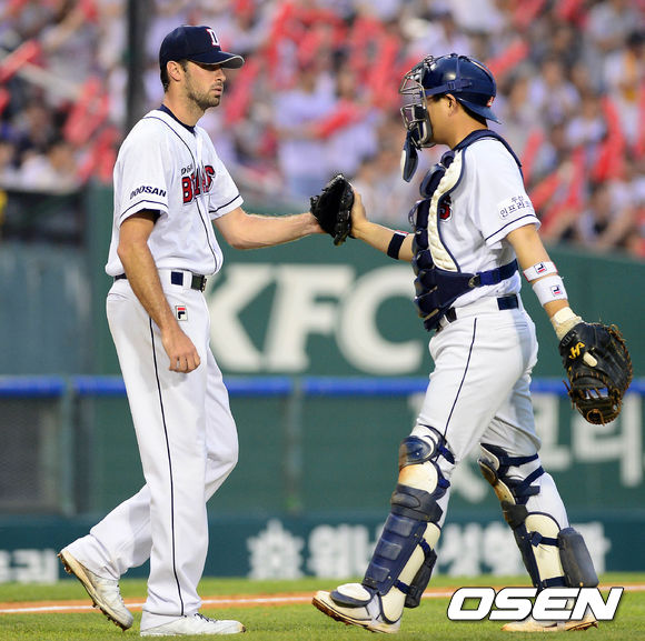 27일 오후 서울 잠실구장에서 열린 '2013 한국야쿠르트 세븐 프로야구' 두산 베어스와 LG 트윈스의 경기 3회초 무사 1,2루 오지환의 번트를 잡아 1루로 송구 아웃시킨 양의지가 핸킨스와 하이파이브를 하고 있다.