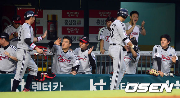 27일 오후 서울 잠실구장에서 열린 '2013 한국야쿠르트 세븐 프로야구' 두산 베어스와 LG 트윈스의 경기 3회초 1사 만루 정의윤의 2타점 적시타에 홈을 밟은 박용택과 손주인이 덕아웃에서 동료들과 하이파이브를 하고 있다.