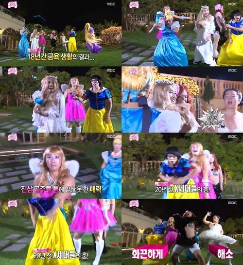 7명의 멤버들은 27일 오후 방송된 MBC 예능프로그램 '무한도전'에서 각자 다른 공주 분장을 한 채 등장, 화끈한 댄스 신고식을 선보였다.