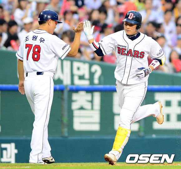 27일 오후 서울 잠실구장에서 열린 '2013 한국야쿠르트 세븐 프로야구' 두산 베어스와 LG 트윈스의 경기 3회말 선두타자 이원석이 솔로포를 치고 조원우 코치와 하이파이브를 하고 있다.